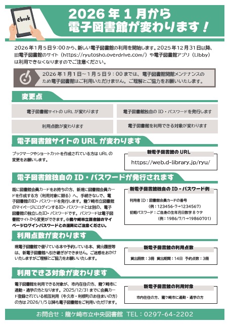 2026年1月5日9:00から、新しい電子図書館の利用を開始します。旧電子図書館のサイト(https://ryutosho.overdrive.com/)や電子図書館アプリ(Libby)は2025年12月31日まで利用できます。