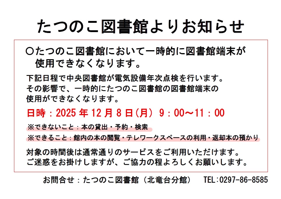 たつのこ図書館において一時的に図書館端末が使用できなくなります。下記日程で中央図書館が電気設備年次点検を行います。