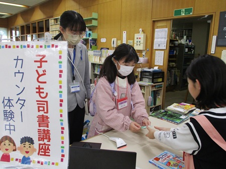 実際にカウンターに出て、貸出・返却の作業をやってもらいました。